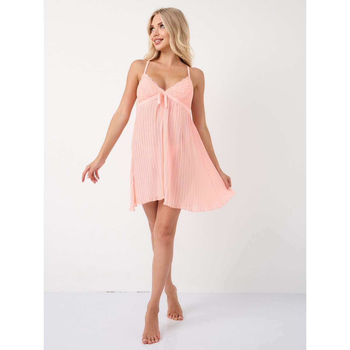 Классическая сорочка babydoll, плиссированная, из шифона, с трусиками-стринг, отрезная под грудью, чашки плотные, украшены кружевом, бретели регулируемые, спинка украшена кружевной вставкой. В комплекте: сорочка, трусики-стринги.