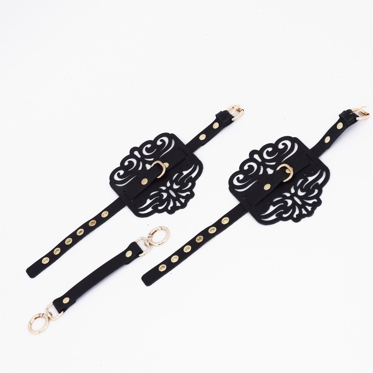 Оковы фигурные из натуральной кожи, украшенные узорами. Каждый элемент дизайна тщательно проработан, чтобы подчеркнуть красоту и элегантность изделия. Золотистая фурнитура, сверкающая на фоне черной кожи, добавляет утонченности и изысканности. Полукольцо, расположенное посередине, предоставляет дополнительные возможности для фиксации рук с помощью соединительного элемента с двумя карабинами, который идет в комплекте. Доставляется в фирменной упаковке в виде брендированной деревянной подложки.