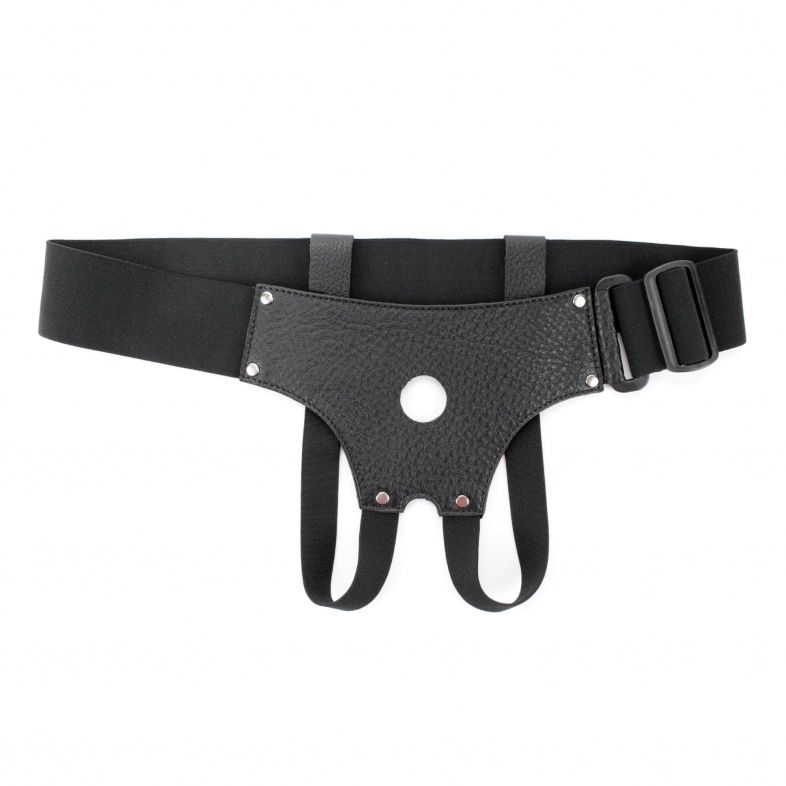Трусики для страпона, изготовлены из кожи, имеют отверстие-доступ в области бикини. Крепятся при помощи широких эластичных лент. Размер легко меняется при помощи застежки. Диаметр отверстия для страпона - 2,5 см.