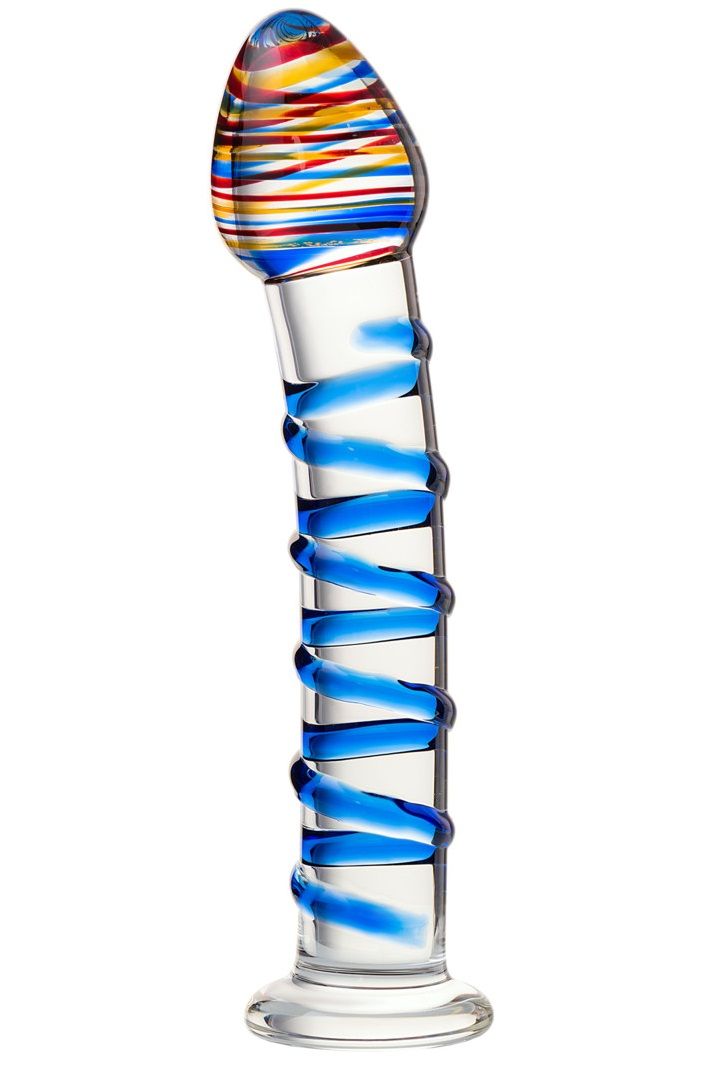 Кристально-прозрачное стекло тела стимулятора опоясано яркой-синей спиралью для дополнительной стимуляции. Фаллос с объемной головкой подойдет для анального и вагинального массажа. Длина - 16,5 см.