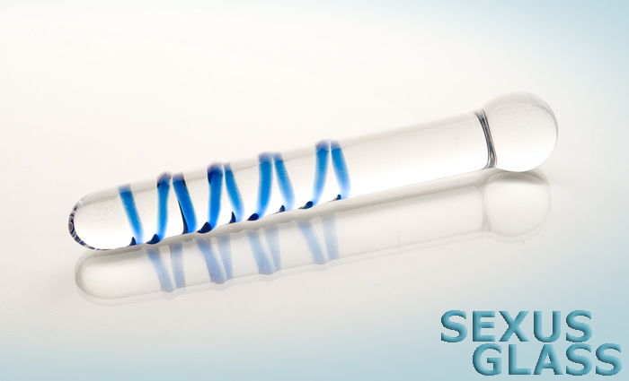 Качественная втулка из прозрачного стекла покрытая спиралью желобков, окрашенных синим цветом. Кольцо-шар для более комфортного использования. Длина - 20 см., диаметр 3,3 и 2,4 см.