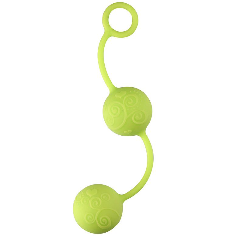 Зелёные вагинальные шарики с завитушками на поверхности. Приятные на ощупь, из силикона.